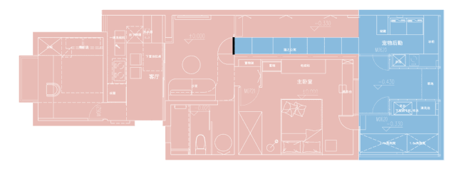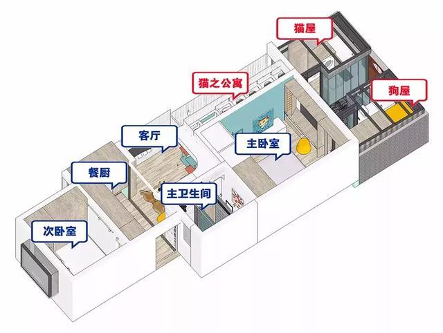 在高密度的人寵混居狀態下,人與寵物的關系是整體設計的重點,首先是對整體功能分區的重新梳理,人類的空間與寵物的空間相互咬合,形成了陰陽的2個空間體系。客廳,次臥和主臥形成人居住的空間,走廊加上院子中的2個小屋形成寵物的空間。兩個空間相互咬合滲透。