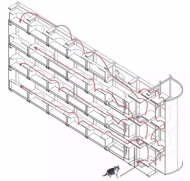 主要的交通核由光之圓筒和垂直樓梯間兩部分組成,當“閥門”關閉時,貓咪主要由垂直樓梯間上下,當“閥門”打開時,光之圓筒與貓之公寓完全聯通,獲得更多的攀爬與跳躍空間。同時“筒中的貓”也作為人類客廳的主要觀景設施之一。