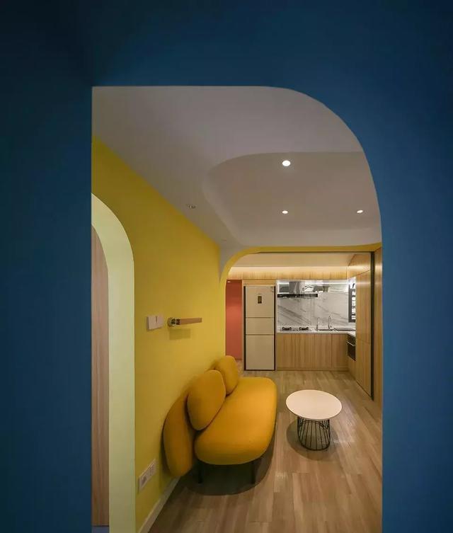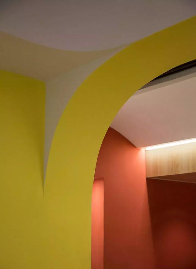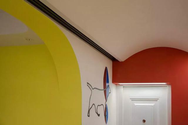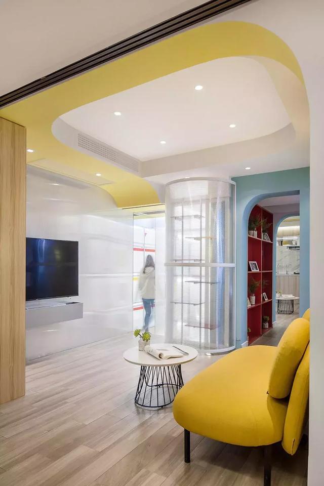 通過明亮的色彩豐富小空間活躍度,同時使得空間更加明亮清晰。紅黃藍的3種顏色的搭配調和整體空間,引導人行流線。客廳主要配色為黃色與藍色,通過黃色的絲帶游走于天花上,強調整體弧線感覺。