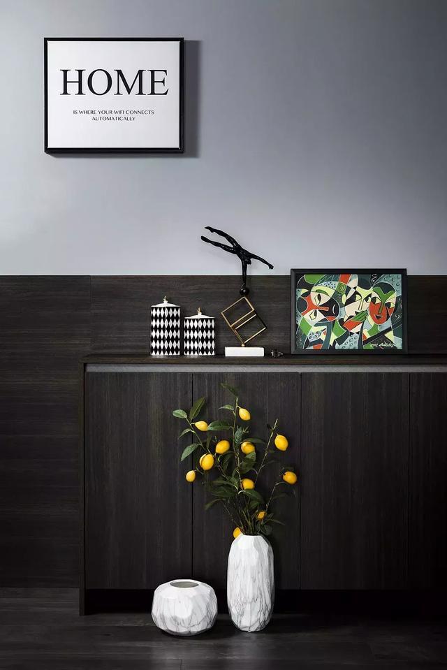 暗木色系餐邊柜位于角落,果實樹枝讓冷色系空間多了一絲生機與活力。