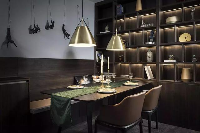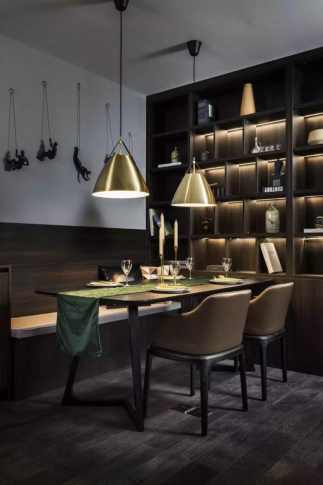 墻面上的雕塑藝術裝置,讓深色系空間多一份活潑。暖色調的燈光,營造出濃郁的就餐氛圍。