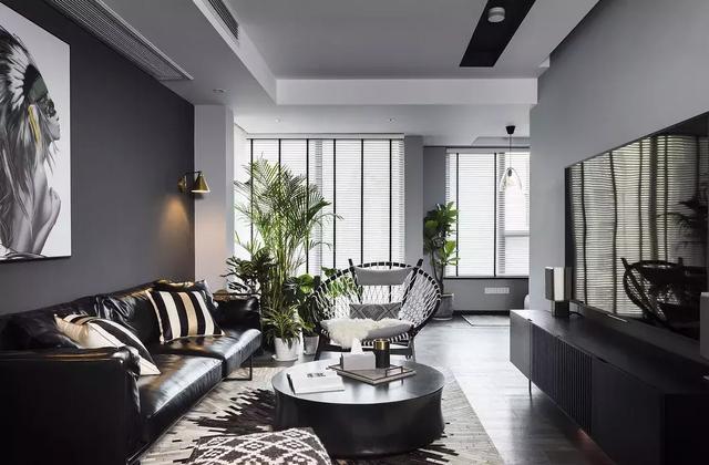 客廳以黑色系為主色調,基于大面積開窗帶來的無限采光和黑色元素的合理運用,客廳并沒有顯得陰暗抑郁。白色百葉窗和少許灰色墻面均衡了視覺的對比,黑色的大氣與白色的優雅,這樣的合理搭配,才是以人為本的人性化設計。