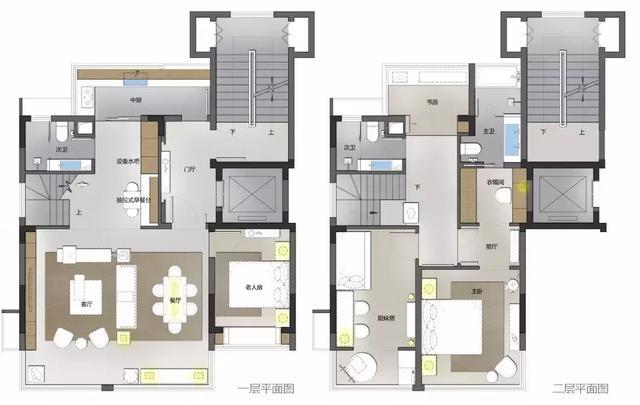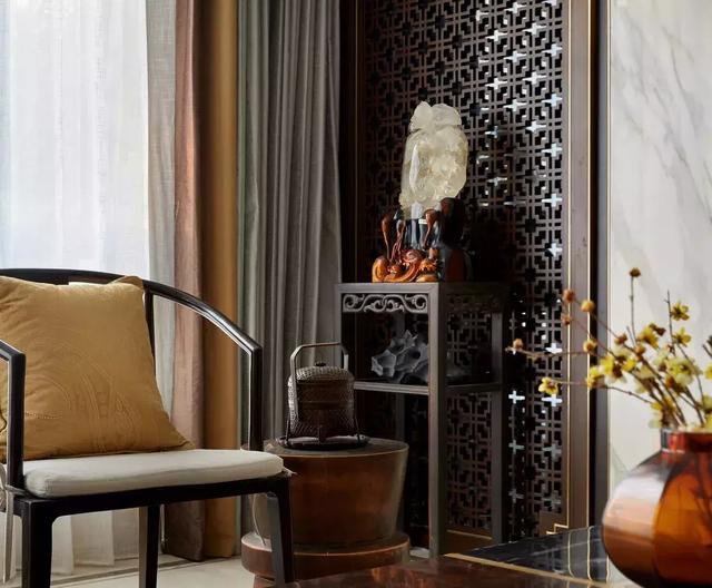 整個色調以鮮艷的杏黃和暖白色為主,再搭配穩重的深棕色,在材料上,使用深色中式花紋格柵和白色石材營造一種成熟穩重的空間感受。