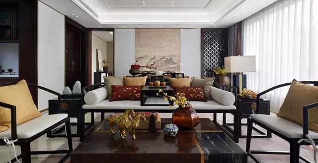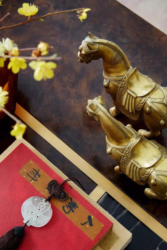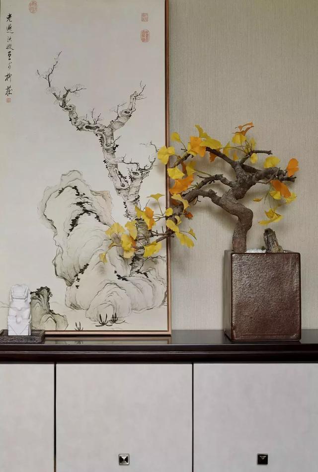 軟裝上,無論是餐廳處袁江的《梁園飛雪圖》,電視柜上山水金箔畫,還是造型考究的羅漢松盆景,都透著不俗的藝術審美的眼光。
