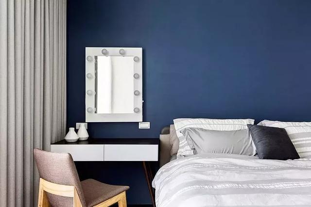 主臥空間以舒適休憩機能為主,透過沉穩深藍墻面取代裝潢勾勒壁面的不同層次,搭配復古化妝燈鏡,點綴出屋主的優雅情調。