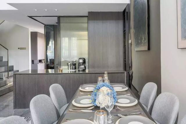 舞動的火苗,溫暖了整個冬季。緊鄰餐廳區域轉身便是開放式廚房,打破原有封閉式的廚房,將廚房與餐廳、客廳連接起來,使居家空間更加通透寬敞、增加互動性。在廚房的吧臺處,享受著甜蜜的下午茶或沉醉在雞尾酒的微醺下,配以舒適、溫暖的場景,給人一種對未來美好生活的向往。