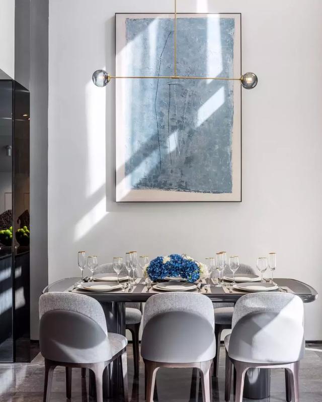 本案設計以四季之“冬”為主題,空間主體色調取自冬季的雪,被賦予陽光“冬”的暖白;結合客、餐廳中地面的灰與其后那一抹高雅的湖水墨藍色垂簾,將“冬”的緘默冷靜勾勒其中,賦予空間不同的情感……