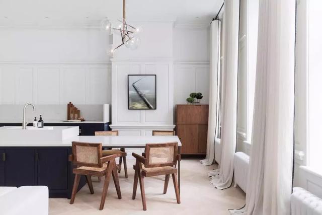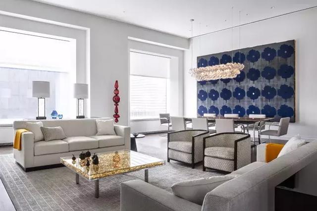在這套案例中,將高級灰和藍色都運用到了居室內的布藝裝飾中,煙灰色沙發及窗簾在白色墻面的映襯下更加挺直優雅,搭配海軍藍絨布擋風沙發椅和極光紅靠包點綴裝飾,簡單的配置,分明的色調對比,層層深入的營造著優雅的高貴感及輕奢范兒。