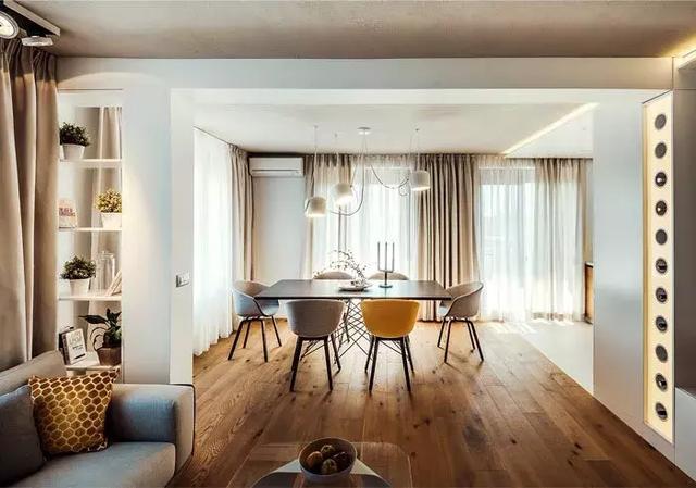 因為墻面、吊頂和地板覆蓋的范圍比較大,并且會奠定整個空間的主色調,采用同一色系或鄰近色系的窗簾,就會給人一種渾然一體的感覺,整個裝修和諧統一,給人溫馨舒適的視覺享受。