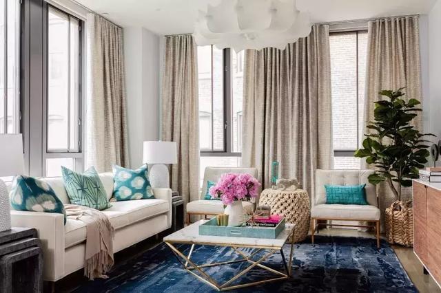 孔雀藍,一種藍中帶綠的色彩,尊貴沉靜而不失生氣。在白色空間中掛起孔雀藍的窗簾,恰似海浪翻涌濺起的浪花,不拘什么形式,靈秀的風韻總是能帶給我們如夢似幻的陶醉。