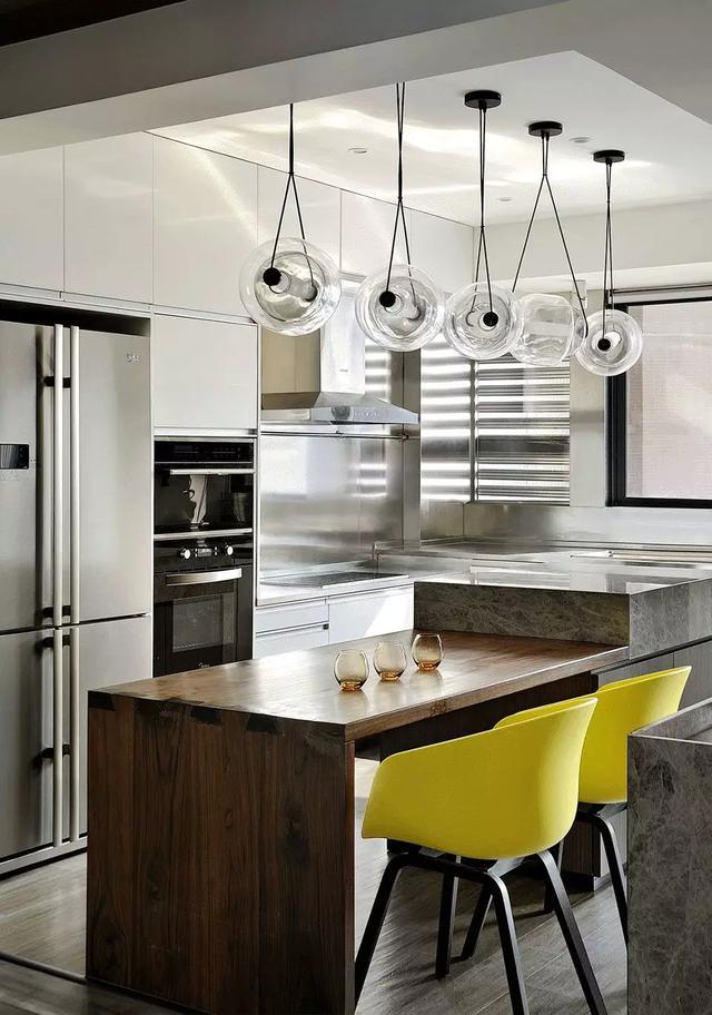 廚房下側(cè)采用白色涂漆,與熱軋后的自然色鋼板結(jié)合在一起。此外,該金屬還用于特殊設(shè)計(jì)的抽煙機(jī),水槽下的柜門板,以及廚房后身的櫥柜單元。