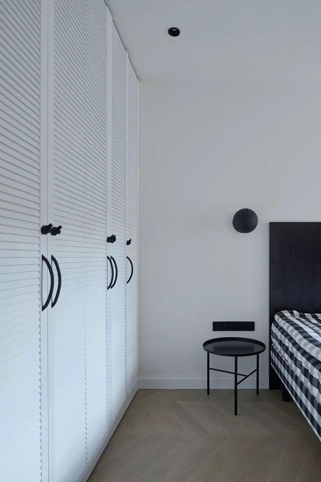 臥室的定制衣櫥擁有極為特別的櫥門印花。設(shè)計(jì)師出其不意的使用編繩作為櫥門把手,并將這一設(shè)計(jì)元素進(jìn)一步用于整間公寓的設(shè)計(jì)中。一扇玻璃窗讓臥室與浴室建立趣味的聯(lián)系。來自瑞典的海絲騰床墊和特殊定制的床頭板,以及小巧靈活的邊桌,為這一空間創(chuàng)建了獨(dú)有標(biāo)簽。