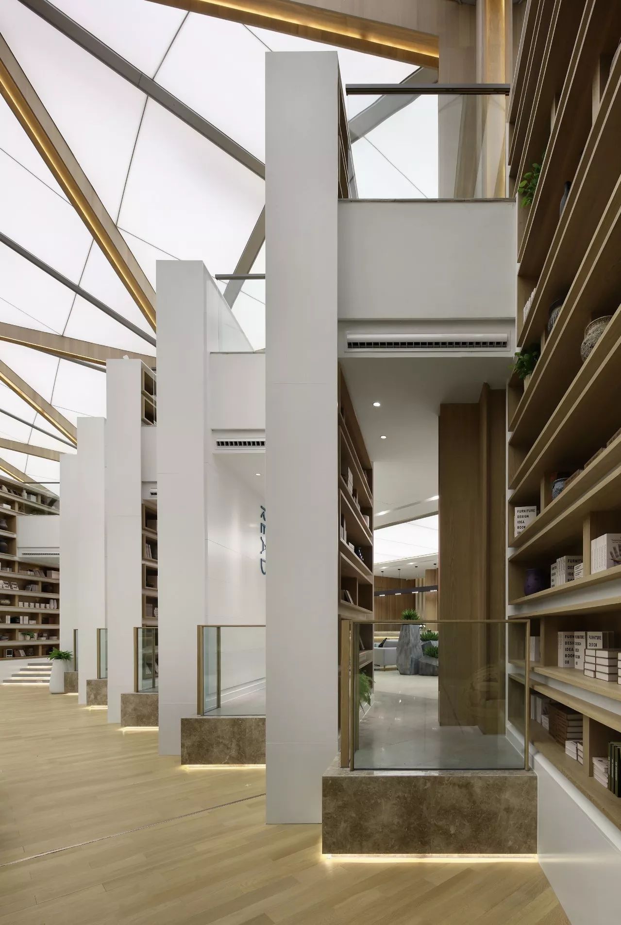 與建筑外觀一脈相承的幾何元素依然是室內(nèi)空間的主要元素,運(yùn)用幾何韻律的書架、屋頂及桌椅藝術(shù)造型來塑造意境,譜寫出一派前衛(wèi)、自然、輕盈的韻律。溫潤(rùn)的實(shí)木和通透的玻璃構(gòu)成視覺的主流,無論是自然光或是燈光投射,都能勾勒出如繪畫一般的光影。