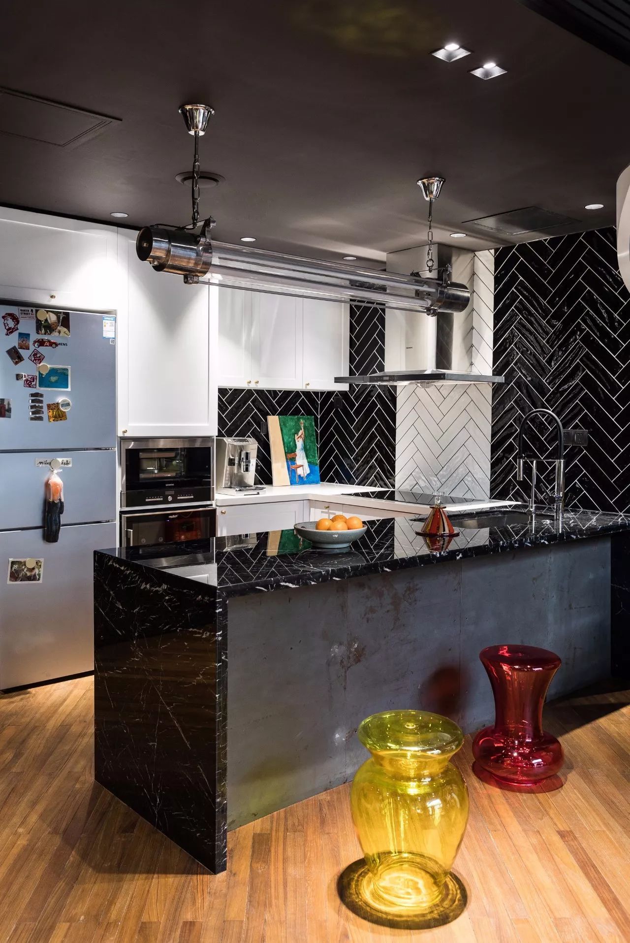 廚房和活動區(qū)并置在一個開放空間,弱化了空間的界限。墻面采用黑白亮面手工磚鋪貼,復(fù)古又現(xiàn)代。