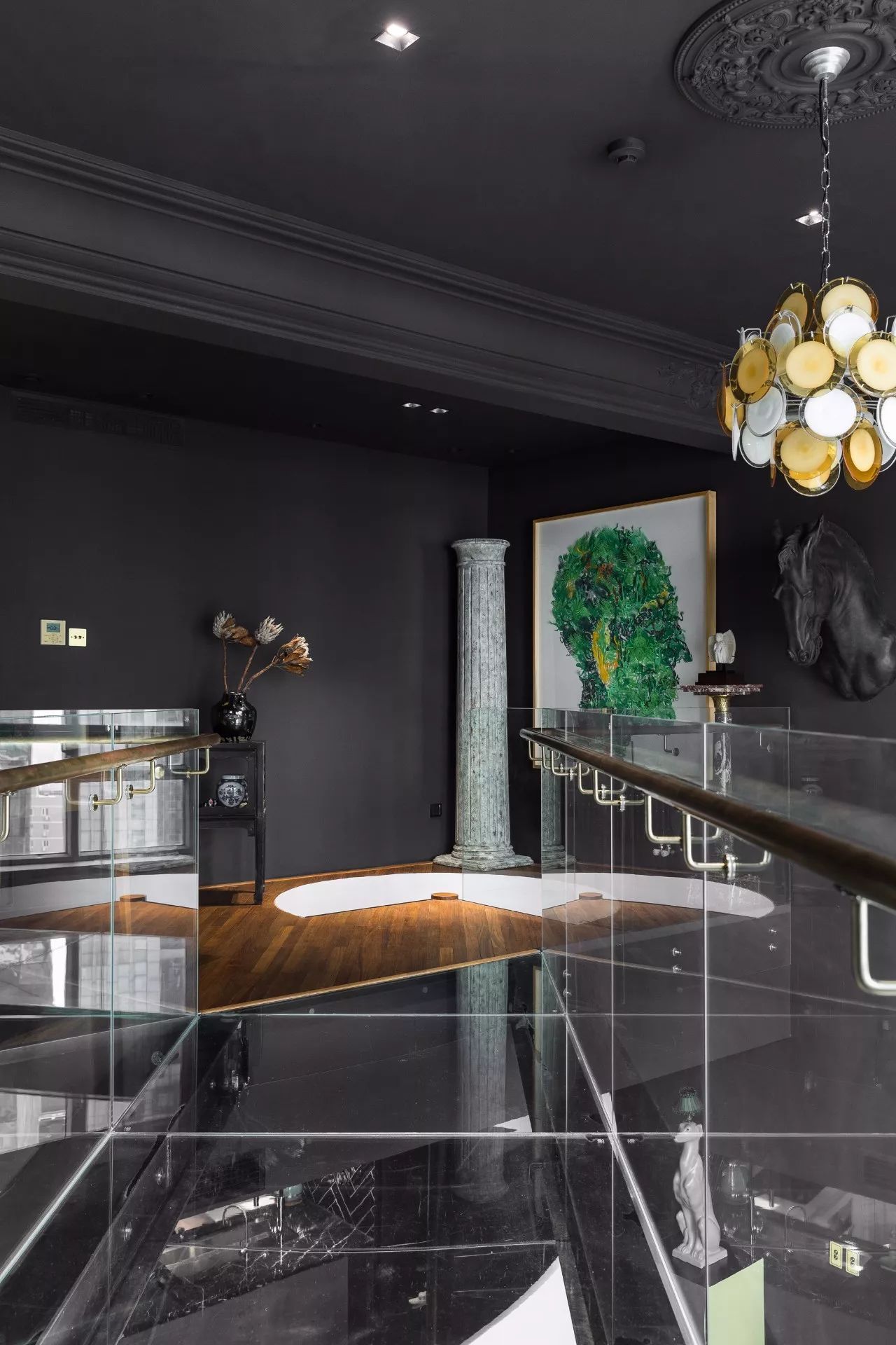 本案是一個隱藏于繁華都市中的普通loft公寓,設(shè)計師拆掉了二層的樓板,一架玻璃天橋騰空而過;所有多余的墻體全被拆除,臥室和衛(wèi)生間也全部開放,采光和空間得到了很大的提升;整個空間以靜謐的黑色為主基調(diào),明黃色的點綴有很強的視覺沖擊。