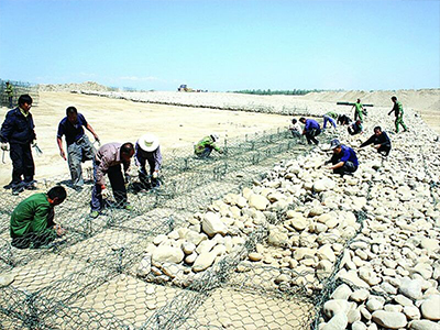 2.石籠組裝把打包的石籠展開,放置在平整堅硬的地面,對網箱的長、寬、高進行適度的拉伸,以恢復變形前的出廠尺寸,然后,按照施工要求對網箱進行組合。