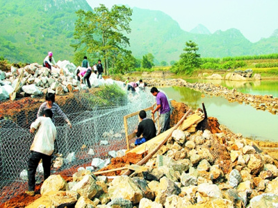 石籠駁岸施工工序:基礎處理-石籠箱體組合-放入預設位置并固定-相鄰網箱聯結-裝填石塊-封蓋聯結。