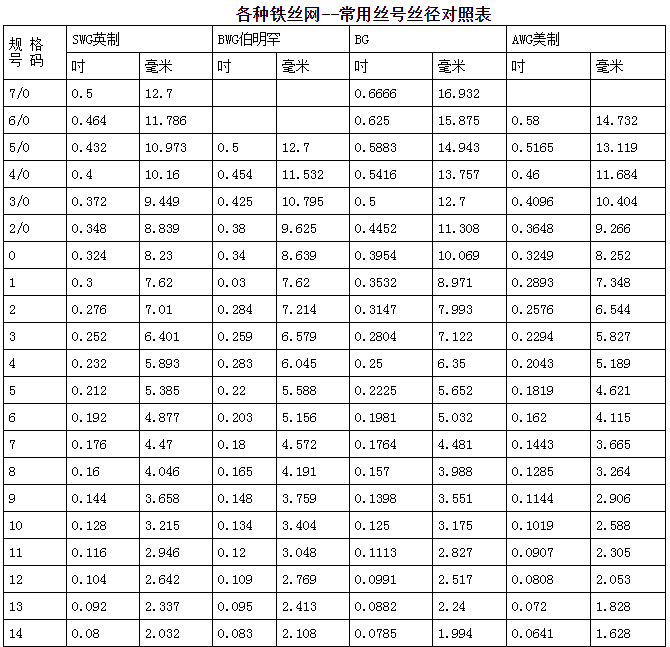 其實不同的國家對于絲號都給出了一個準確的數值,這樣就形成了不同的標準,有美制,有英制,有伯明翰等,這里有一個表格,大家可以看一下: