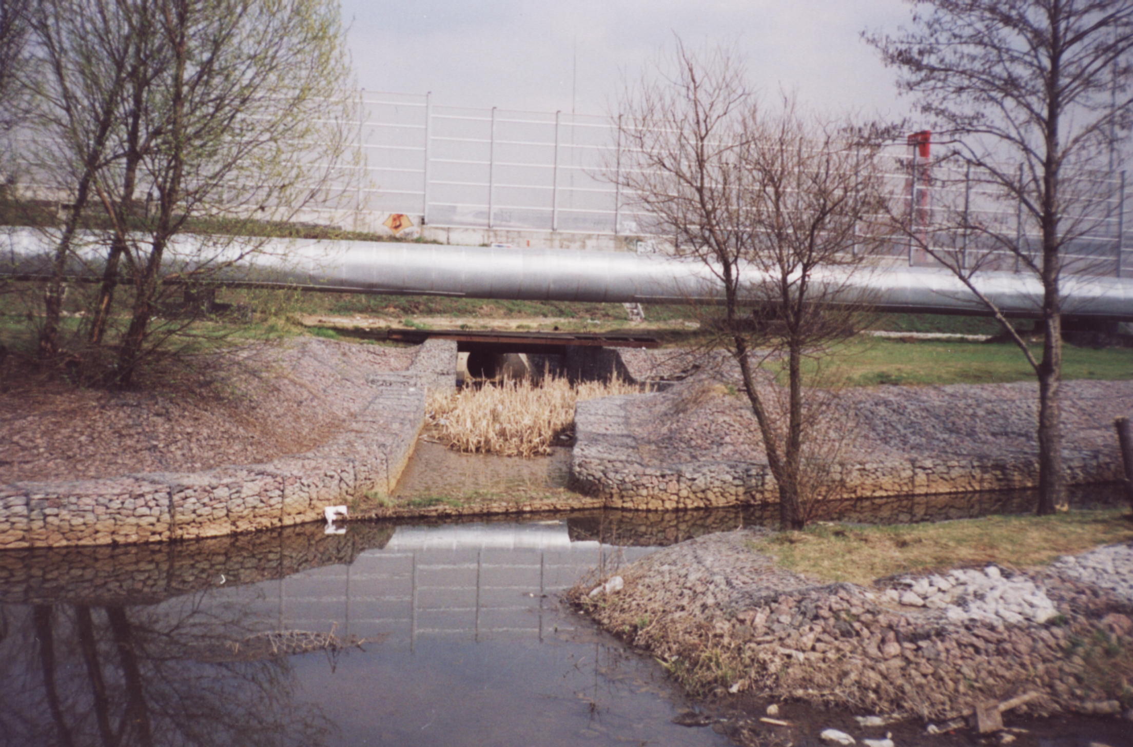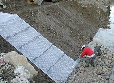 格賓護墊的結構型式為在坡面上鋪一層300g/㎡的短釬針刺非織造土工布,土工布各幅之間采用縫接,其上鋪100mm厚的碎石墊層,再鋪設300mm厚的格賓護墊,格賓護墊規格為6000×2000×300mm(長×寬×高),內部每間隔1m采用隔板隔成獨立的單元,網孔孔徑為80×100mm(D×H),鋼絲為鍍5%鋁-鋅合金加稀土元素,格賓網絞制類型為五絞格網,箱體之間采用格賓絲鏈接。