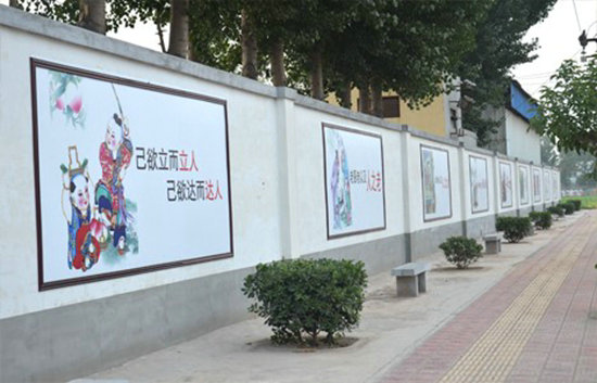 “仁、義、禮、智、信”、“百善孝為先”等文化墻既美觀大方,和周邊環境相互協調,又具教育意義,于細微處起到潤物無聲的作用;“講文明樹新風”、“勤儉節約”等內容的文化墻潛移默化中影響著村民……“文化墻就是一本不用打開的‘書’,便于閱讀、理解,稍微一讀就能給人啟發。”
