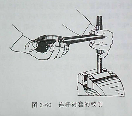 3、鉸削:鉸削時,一手把住連桿大端,并均勻用力撥轉,一手把持小端,并向下施壓力進行較削。較削中應保持連桿與較刀成直角,以免鉸偏(如圖3-60所示)。調一次鉸刀銨到底后,再將連桿翻面鉸一次,以免鉸成錐形,當襯套下平面與刀刃下方向平齊時,應下壓連桿小頭,使襯套從銨刀下方脫出,以免起棱。