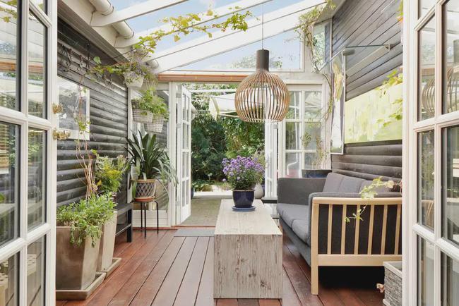 玻璃陽光房效果圖采用斜頂?shù)脑煨?,木制的家居與綠植,流露出一股清新和自然的感覺,整體氛圍簡潔、溫馨、活潑。緊挨著房屋而建,第二個門通往院后花園??梢宰谏嘲l(fā)上看著夜晚的星空,那是多么愜意的享受。