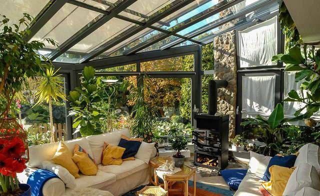 被大量植物環繞,是一個注重自然的陽光房效果圖設計,斜頂的造型增加了陽光房效果圖設計的趣味性。色彩明亮的布藝沙發,加上一旁的暖爐,營造了舒適的休息區。安裝遮陽簾,避免被強烈陽光的照射。整體氛圍舒適有溫馨。