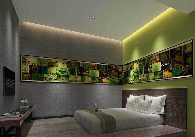 在星級酒店設計過程中,室內的色彩設計與服裝、產品的色彩略有差異。服裝、產品的色彩所指范圍較小,且具有可移動性。與某一“物品”的色彩相比,“嫉妒的色彩設計所占面積更大,它是一個巨大的空間,并且能夠成為背景,使我們置身其內。這就是所謂的”色彩設計具有較強的環境性“。