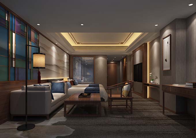 1、廣州商務酒店設計在選用窗簾軌道時,一定要選用耐用的材料,遮光布要選較厚的,簾布的皺折要適當,而且要選用能水洗的材料,若只能干洗的話,運營成本會增加,得不償失。
