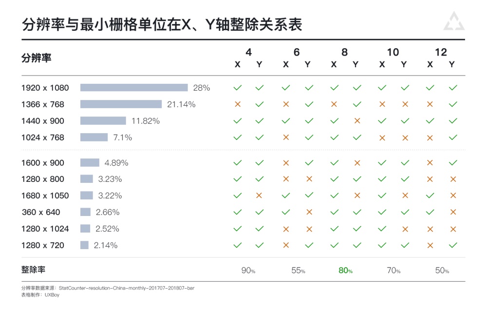 我們選取4、6、8、10、 12 為柵格的候選原子單位,然后用目前主流屏幕分辨率與其相除,判斷各個分辨率在豎直(y)與水平(x)方向能否被候選原子整除,統計結果如圖。