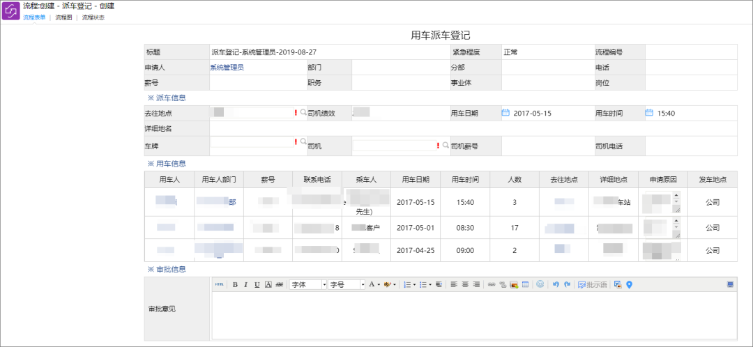車輛管理員進(jìn)行車輛排出登記,審批通過之后自動形成出車記錄臺賬。