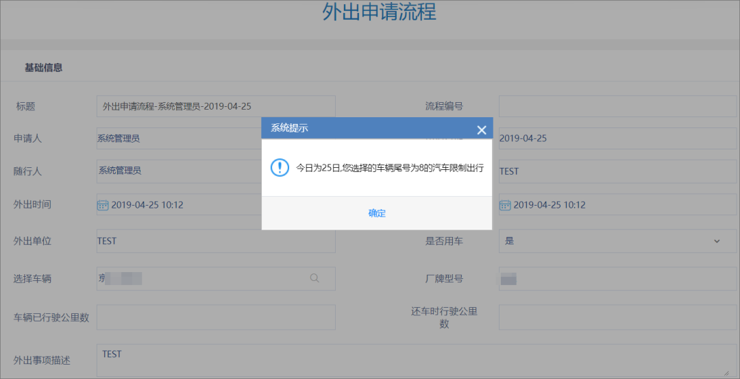 泛微OA系統(tǒng)通過建模,搭建“限號規(guī)則表單”,并且在用車流程增加相關(guān)字段。在提交用車流程時,根據(jù)時段對限行車輛給出提醒。