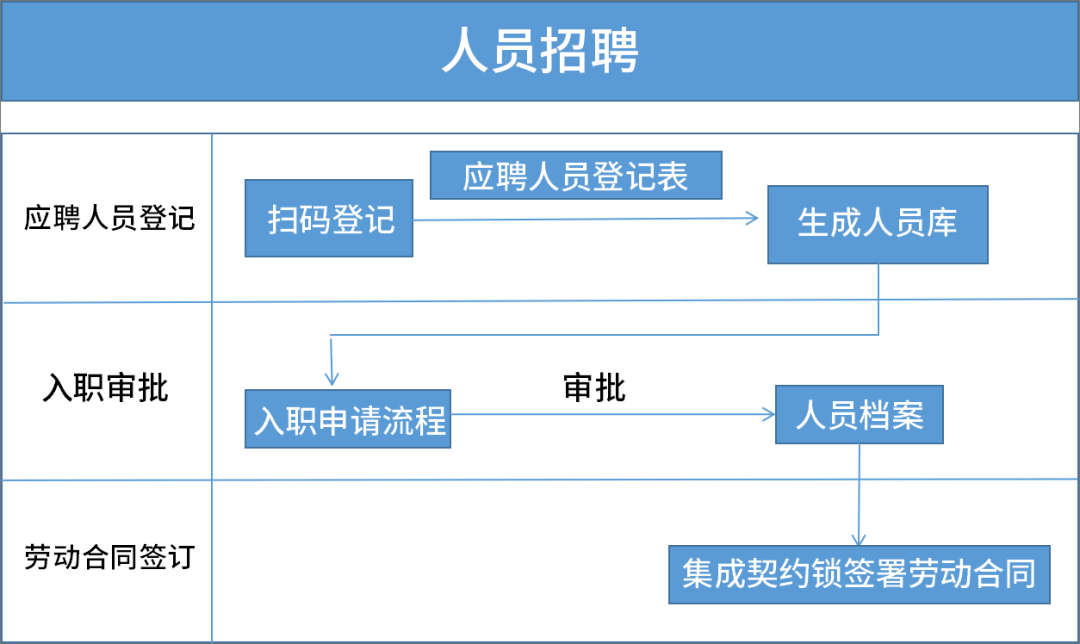 若是該人員確定入職,可觸發(fā)“新員工入職申請流程”,并將登記表部分信息帶入“新員工入職申請流程”,入職審批通過后集成契約鎖簽訂電子勞動合同,同時在人事管理模塊建立人員檔案。