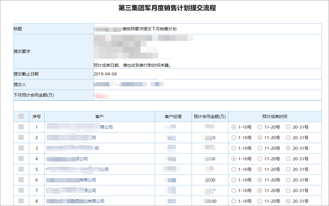 泛微在OA系統(tǒng)中搭建了上報流程,并且根據(jù)實際上報周期設(shè)置提醒。各區(qū)域負(fù)責(zé)人接到上報計劃表,可根據(jù)區(qū)域情況上報具體可能成交的客戶清單及預(yù)計成交時間段。
