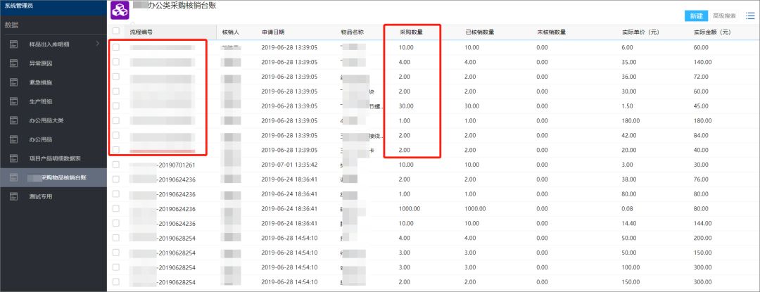 采購人員在OA發(fā)起采購申請,流程歸檔生成采購物品臺賬,記錄各物品未核銷數(shù)量;