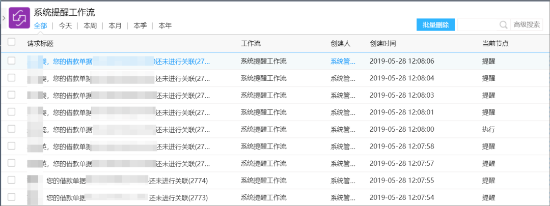 在后臺配置好提醒方式后,系統(tǒng)會自動觸發(fā)一條提醒工作流,發(fā)送到借款人待辦中,提醒該員工盡快進(jìn)行報銷辦理。