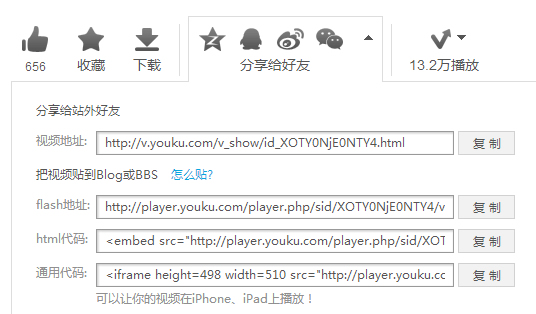 提示:其它一些視頻網站,像土豆、騰訊......知名的視頻網站都有相應的分享給好友或其它網站功能。