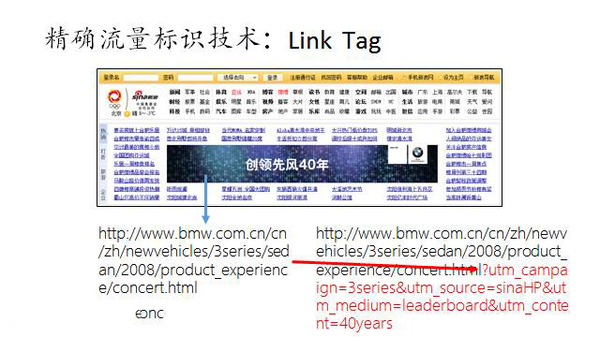 Link tag的意思,是在流量源頭的鏈出鏈接上(鏈出URL上)加上尾部參數(shù)。這些參數(shù)不僅不會(huì)影響鏈接的跳轉(zhuǎn),而且能夠標(biāo)明這個(gè)鏈接所屬的流量源是什么(理論上能夠標(biāo)明流量源的屬性數(shù)是無(wú)限的)。