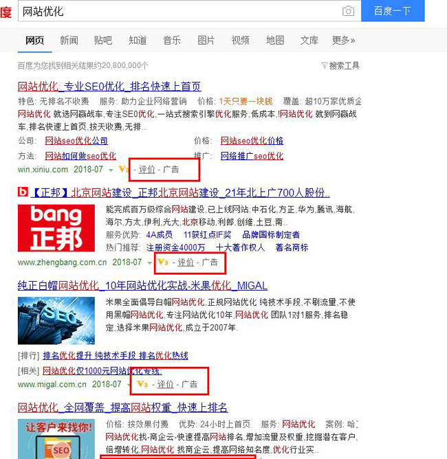 一般來說,廣告商在投放關鍵詞廣告時,必然已經做了詳細的競爭程度分析及贏利分析,只有能產生效果和贏利的關鍵詞,他們才會去投放廣告。如果說搜索結果數還只是網上內容數量帶來的競爭,競價數則是拿著真金白銀與你競爭的真實存在。竟價結果數量直接就反應了關鍵詞商業度的高低,商業度越高的詞勢必競爭者越多,相應優化難度也會更大。