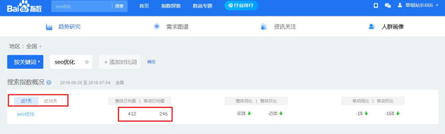 關鍵詞搜索次數可以通過百度指數、360指數、搜狗指數等來查看,主要反應了這個關鍵詞的用戶搜索頻繁度,日搜索量越大,說明該詞價值越高,競爭難度也會越大,相應的優化難度也越大。