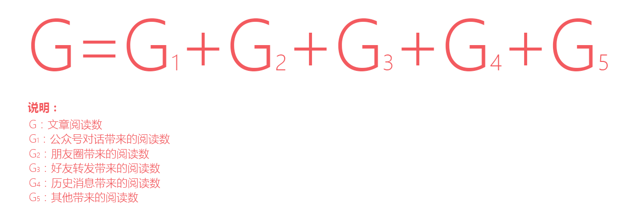 通過公眾號后臺的數據統計維度進行劃分,一篇文章的閱讀數G=G1+G2+G3+G4+G5。