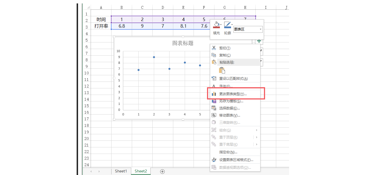 將導入的數據隨意生成圖表,在圖表上方點擊右鍵,選擇“更改圖表類型”。