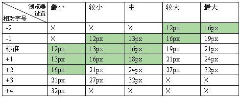 以IE瀏覽器為例,例如,如果頁面上的文本設置為相對字體大小,所以它可以有五個不同的縮放:“最小的,較小,中和較大,大”。下表的區別是不同的相對在IE瀏覽器字體大小設置所示實際尺寸(大小以像素為單位)。