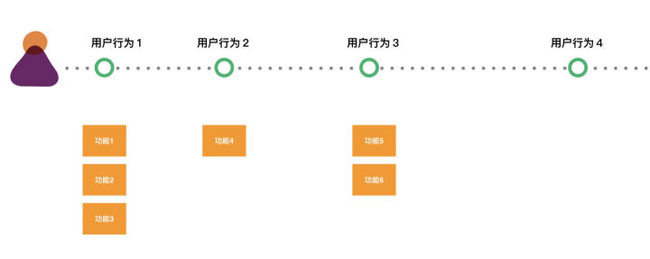 我們會在上面畫一條軸,標示出用戶旅途。這是用戶在使用軟件的時候的,他的一個全過程。然后在對應的時間點上,標記出,我們的功能。這樣我們的功能就不是平白出來的。每一個都聯系了用戶價值。在ThoughtWorks,我們可能標記的是用戶故事,相對于功能,用戶故事,首先就是要寫出價值。