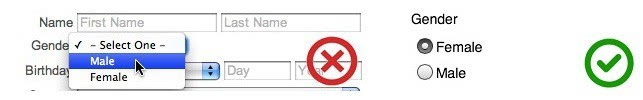 如果可能的話,使用單選框代替下拉列表菜單。單選框的認(rèn)知負(fù)荷很低,因?yàn)樗拿總€選項(xiàng)是可視的,所以用戶可以容易比較。