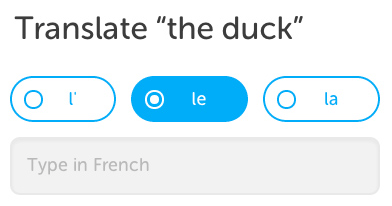 在多鄰國app中,水平排列的單選框得到了很好的應(yīng)用:設(shè)計(jì)師采用了傳統(tǒng)的水平對齊方式,通過視覺手法把選項(xiàng)設(shè)計(jì)的清楚分明,又?jǐn)U大了點(diǎn)擊區(qū)域,更適用于在觸控設(shè)備上操作。