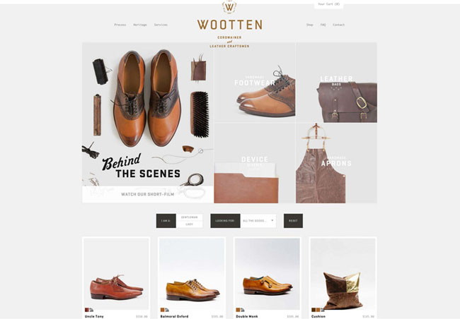 我最喜歡的超大型背景照片是當設計師巧妙地使用照片,把它同時作為背景的首頁元素。在這些設計中,把產品放在首頁最前的位置,下滑就可以看到產品的細節或者配件。通常這是使用產品或前景元素作為焦點來實現的。這種混合使得照片營造了一種時尚感,而內容又非常有價值。這一具有挑戰性的方法與你的攝影師好好規劃協調,得到的最終布局一定非常吸引人。