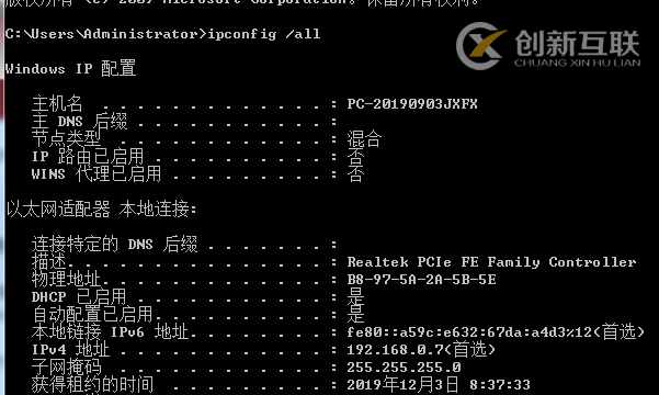 如果計算機和所在局域網使用了動態主機配置協議(DHCP),那么使用ipconfig命令就可以查詢到你計算機的IP地址,包括子網掩碼和缺省網關等等一些網絡配置信息。