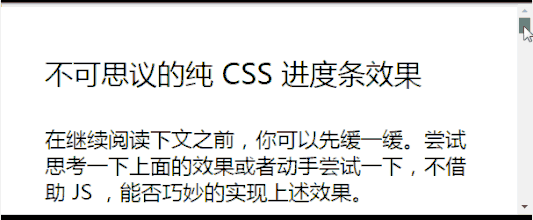 如何實(shí)現(xiàn)網(wǎng)頁頂部展現(xiàn)的滾動進(jìn)度條隨著頁面的滾動進(jìn)度而變化長短這樣的效果?很多網(wǎng)站制作開發(fā)人員看到這樣的效果時,第一反應(yīng)就是借助Javascript,但是這樣簡單的效果用JS來實(shí)現(xiàn)是很麻煩的,我們可以用CSS來實(shí)現(xiàn)以下進(jìn)度條的滾動效果。