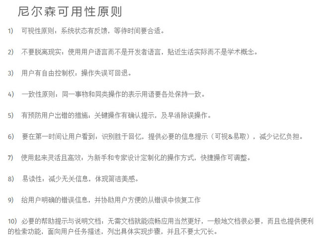 當(dāng)設(shè)計(jì)完成后最好對(duì)自己的方案進(jìn)行排查,很多時(shí)候容易當(dāng)局者迷“忽視”了很多問題。這里可以積極請(qǐng)教同事尋找問題,或者使用尼爾森的可用性原則進(jìn)行排查。